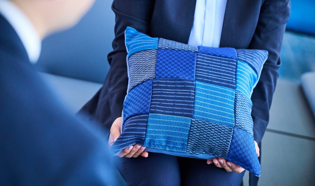 - 一枚の端切れから数センチ四方のパーツしか取れない状態だったので、内心驚きました(笑)ですが、環境負荷低減を“体裁”ではなく“本気”で実行されているのだと、改めて感銘を受けました。みんなで頭を捻って、「パッチワークにしたら大きなサイズの商品にできる」とご提案し、最終的にパッチワーククッションを採用していただきました。