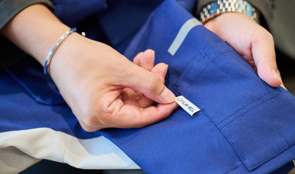 この取り組みをより分かりやすく伝えるため、フィルムリサイクル生地であることを示すオリジナルのピスネームを取り付けています。弊社ではこれまで約2,000社のユニフォームを手がけてきましたが、このような事例は初めてで、日本国内でも非常に珍しいケースです。まだまだ実現には課題の多いサステナビリティ領域で、挑戦し続けるT D K様の強い意思を感じています。
