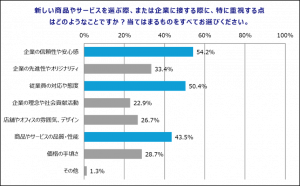 新しい商品やサービスを選ぶ際、または企業に接する際に、特に重視する点について質問したところ、最も多かった回答は「企業の信頼性や安心感」(54.2%)、次いで「従業員の対応や態度」(50.4%)、「商品やサービスの品質・性能」 (43.5%)となりました。「商品やサービスの品質・性能」よりも「企業の信頼性や安心感」が多い結果となり、企業ブランディングの重要性が明らかになりました。
