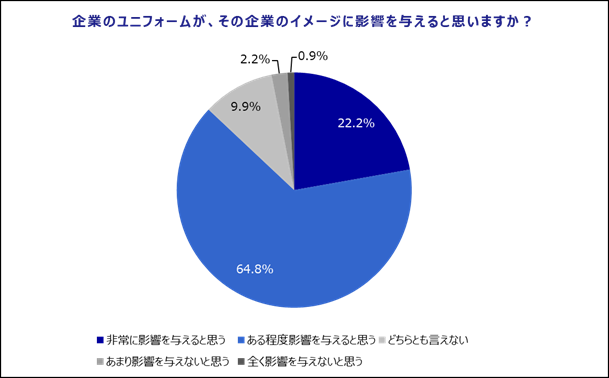 「企業のユニフォームが、その企業のイメージに影響を与えると思いますか?」という設問に対し、「非常に影響を与えると思う (22.2%)」「ある程度影響を与えると思う(64.8%)」と回答した人が87%を占めました。ユニフォームが企業イメージに大きな影響を与えることがわかりました。