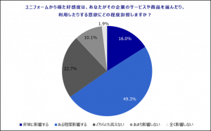 「ユニフォームから得た好感度は、あなたがその企業のサービスや商品を選んだり、利用したりする意欲にどの程度影響します か?」という設問に対し、「非常に影響する(16%)」「ある程度影響する(49.3%)」と回答した人が65.3%を占め、ユニフォームから得た好感度がサービスや商品の購買・利用に影響することが判明しました。