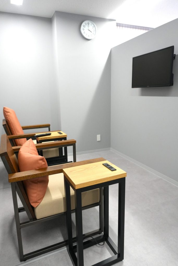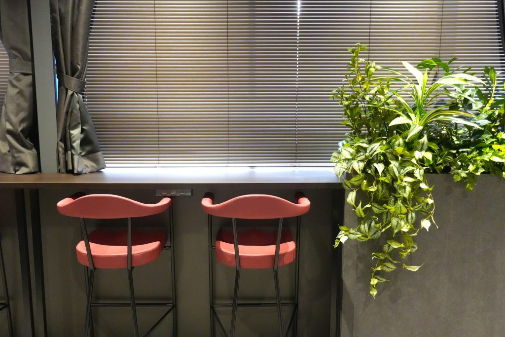 ・2階の食堂兼会議室は、「ISUZU」のロゴを際立たせ、ブランド発信の場を体現しています。ラウンジをイメージして、部屋のトーンを落とし、人工植物を随所に配置。1人でも利用できるカウンタースペースを設けました。