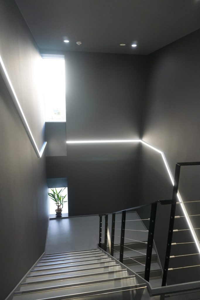 ・1階から2階へ上がる階段には、直線状のライトを設け、「進化」や「未来」を感じさせるデザインを施しました。