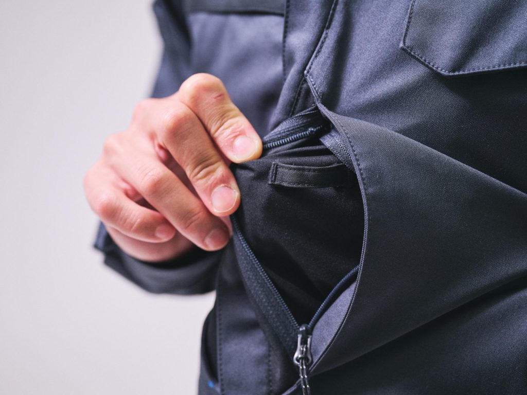 シャツとブルゾンの胸ポケットの中にはループをつけ、スマホを結びつけることで落下を防ぎます。